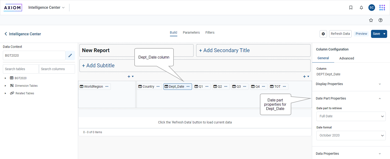 You can now report on Date and DateTime columns using date parts in Axiom queries. When using date parts—such as Year or Month—the column data is effectively transformed into the specified date part for purposes of the report. This allows you to not only display the specified date part, but also group, sort, and filter the query by the date part.