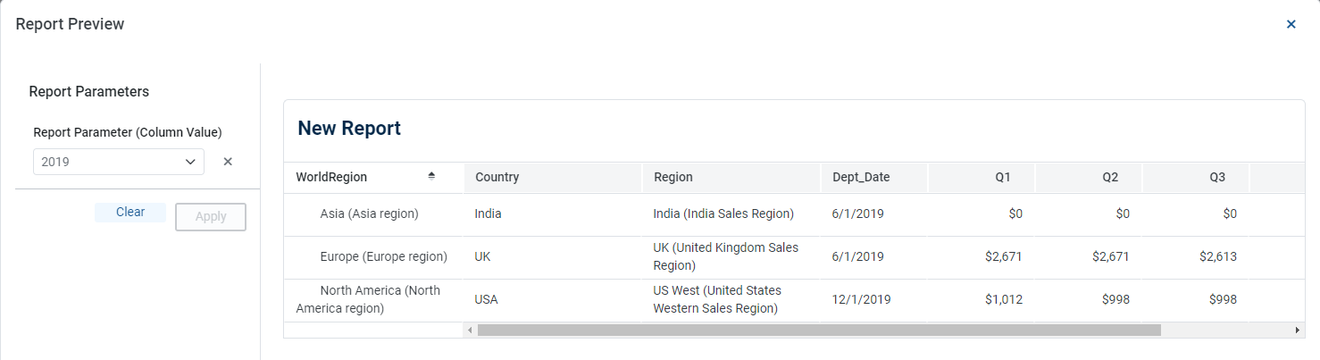 When you view the report, if you hover on Europe, the drill icon is displayed. When we click Europe, we see Dept_Date configured as YearMo and the drill results are grouped by that date part.