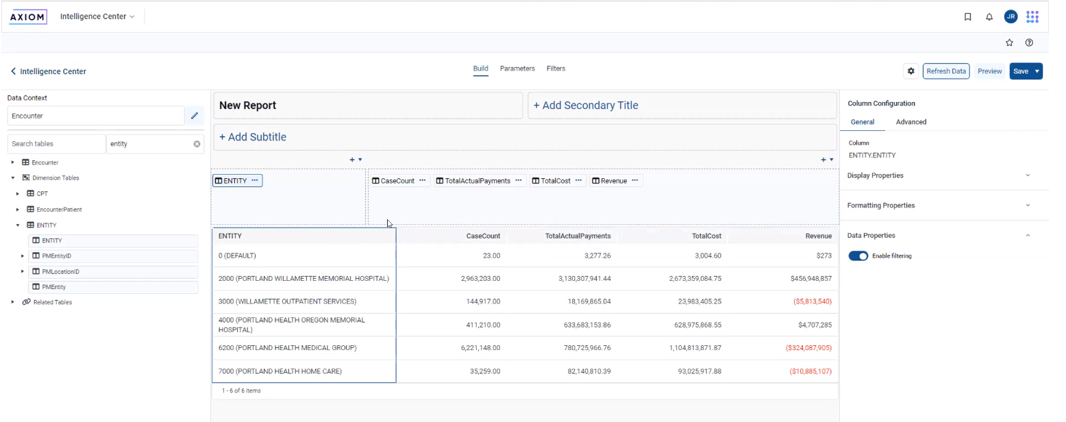 When building a fixed row structure with large tables (such as the Encounter table) dimension mapping is now disabled, as it can cause performance issues. Instead, you can use the filter wizard to define that row in a report.