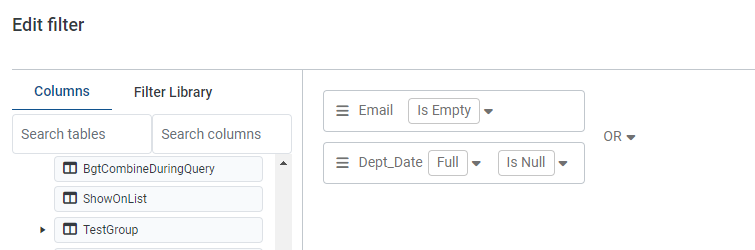 The filter wizard now supports the use of Is Null/Is Not Null (for numeric values) and Is Empty/Is Not Empty (for strings). In this example, we used Is Empty for Email to see which people did not have an email address and Is Null for DEPT_DATE to see where date records using the FULL year option are not present.