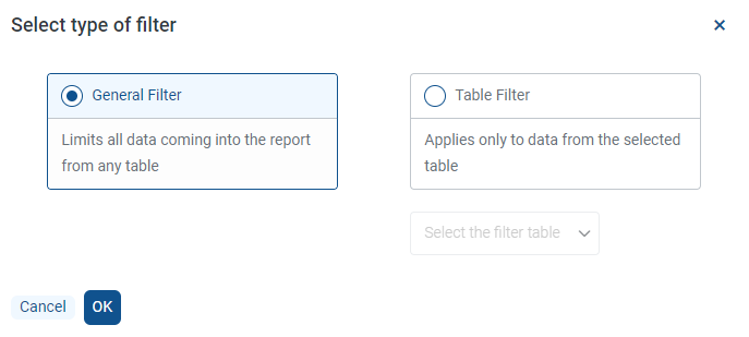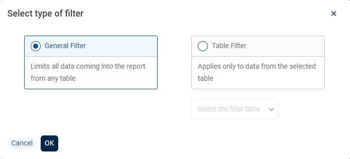 This feature changes how user create filters on the Filters tab of the Report Builder. Previously, users clicked the Add button with a drop-down menu to select General or Table-Specific to open the Filter Wizard.