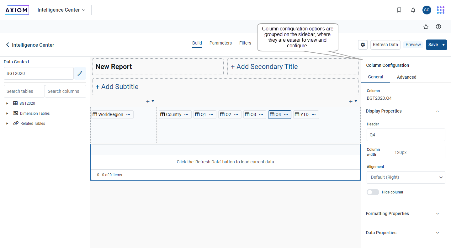 To improve the user experience, the column configuration properties have been grouped in the sidebar for ease in selecting and setting up properties.
