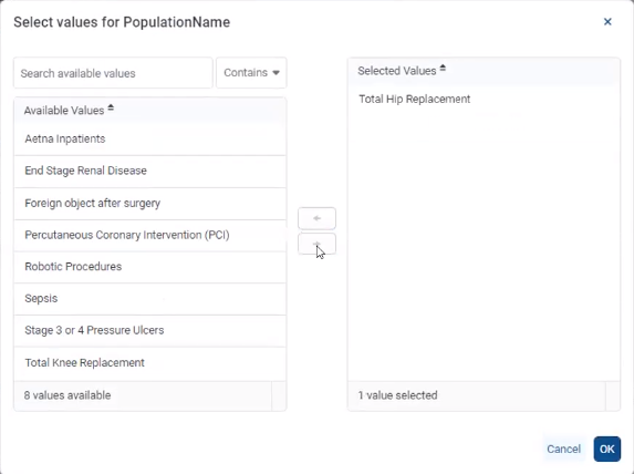 For this report, you can view information about a specific population group, such as patients who have had a total hip replacement.