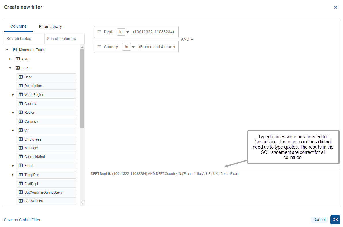 When you enter simple string values, you do not have to place the quotes around the string because they are added automatically. In this example, the string contains several countries (France, Italy, US, UK) without quotes. In the case of Costa Rica, you must add quotes because that country has two words.