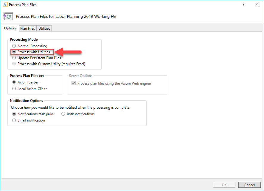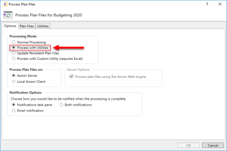 If processing the web-based plan files, in the Options tab, in the Processing Mode area, select Process with Utilities. This option should be selected by default.