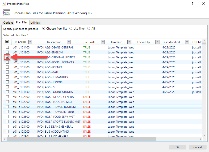 In the Plan Files tab of the Process Plan Files dialog, select the check box next to the plan files to process.