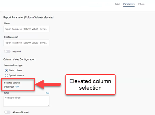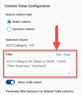 When you select a column in the report parameter column value settings, a Filter field is available for you to filter the values within the associated column. Click Edit above the Filter field to select filter options for the associated column.