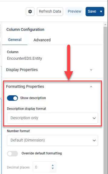 You can display the Description field when exporting reports from the report viewer to delimited files. To display description values in the export data, click the Show description toggle in the Formatting Properties area of your report's column configuration settings. You can define the format to display the description by itself or next to the Identity field.