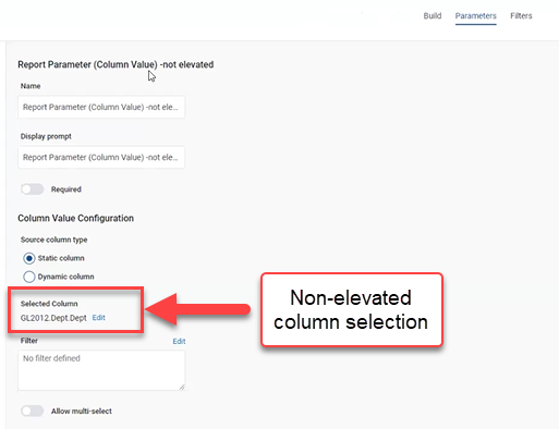 You are now able to add nonelevated columns to narrow the data displayed in a report. Nonelevated columns return only the data associated with a column common between two tables, whereas an elevated column selection returns all data in the row. This function is only available when adding a column using a static column configuration.