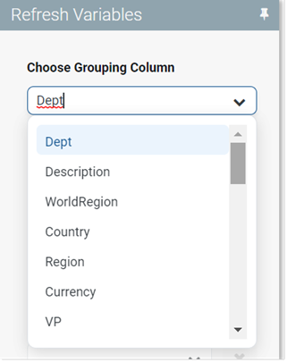 For example, the report may contain a refresh variable that specifies the grouping level (row dimension) of the report. This refresh variable takes values such as Dept, WorldRegion, Country, and so on.