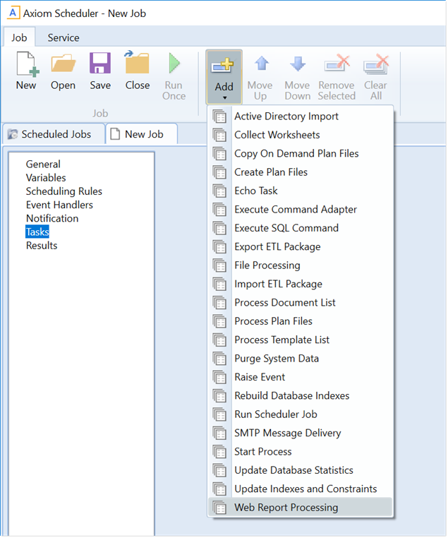 3. Select the Tasks section of the job, then on the Job tab, click Add > Web Report Processing.