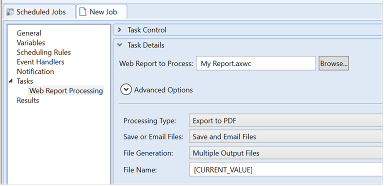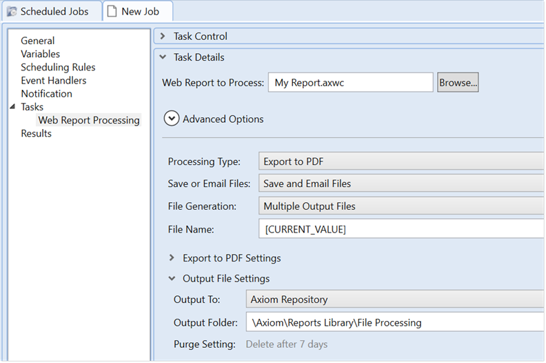 • Generally speaking, the Advanced Options displayed at the top of the Web Report Processing task should only be modified as advised by Axiom Support. For more information on how these settings work, see Scheduler task: Web Report Processing.