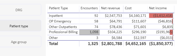 You can choose between three different views of the table: by DRG, by patient type, or by age group.