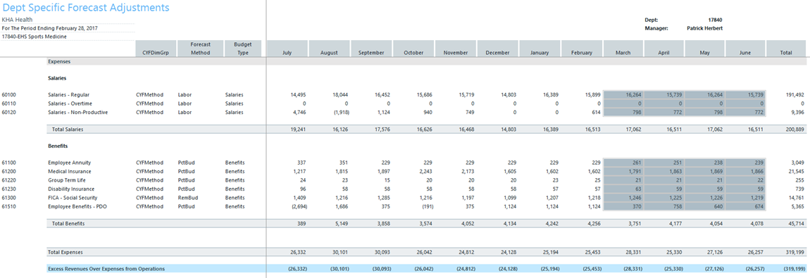 This is a save-to-database report used to make adjustments to the current-year forecast at a specific department and account level.