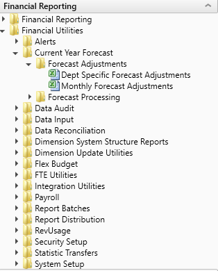 You can also access them from the Bud Admin task pane. In the Financial Reporting section, click Financial Utilities > Current Year Forecast > Forecast Adjustments.