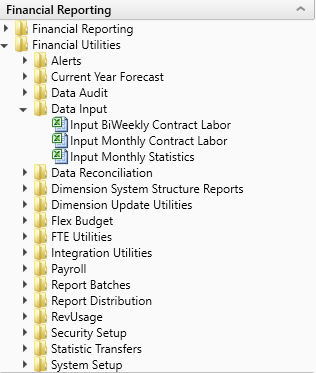 You can also access them from the Bud Admin task pane. In the Financial Reporting section, click Financial Utilities > Data Input.