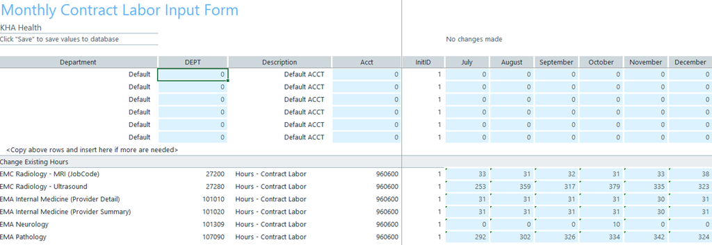 Use as an input report for monthly contract labor hours data collection. You enter monthly hours and then post them to the database from this report.