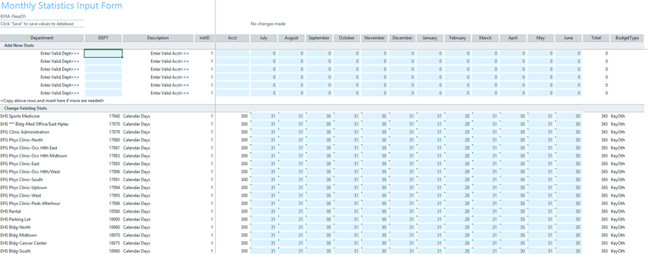 Use to input monthly statistics data collection or calculations. You enter the monthly statistics and then post to the database from this report. In some cases, there may be an import for statistics that already loads statistics on a monthly basis. You can use this report as a replacement for an import or in addition to the statistics import.