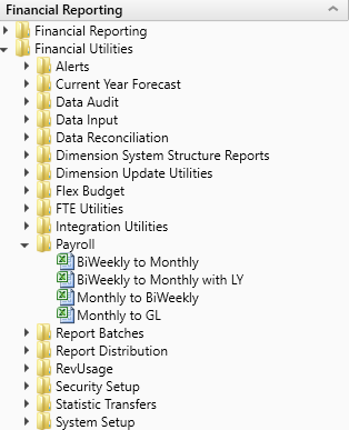 Biweekly to Monthly with LY – Your organization has more than one year of historical payroll data to capture the days of the year-end biweekly payroll that may cross over their fiscal year utilize this utility.
