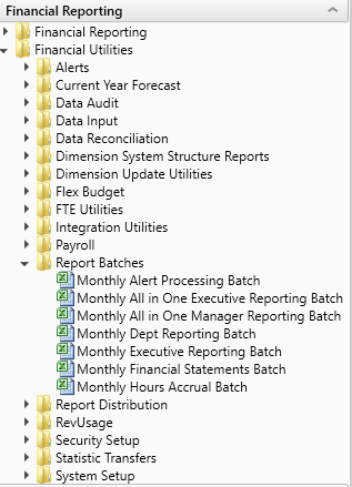 You can also access them from the Bud Admin task pane. In the Financial Reporting section, click Financial Utilities > Report Batches.