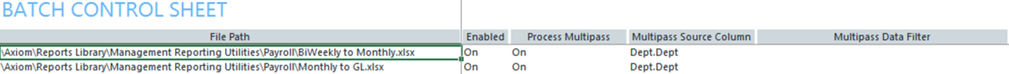 The reports listed in this section are located in \Axiom\Reports Library\Management Reporting Utilities\Report Batches. For instructions, see Browsing the Report Library.