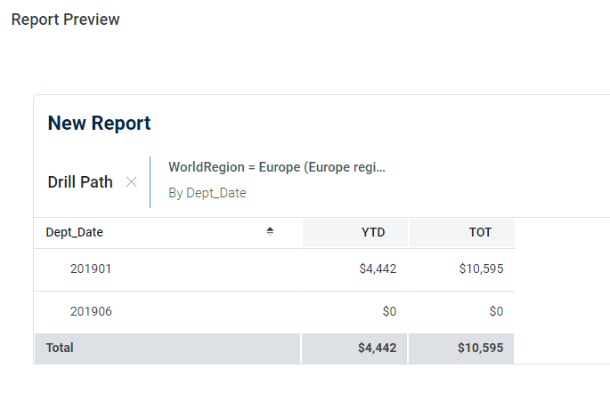 The current drill path displays along the top of the page. The drill path identifies the row that was drilled and the current drill level. If you have drilled the drill results, the previous drill levels also display in the drill path. You can click a previous drill level to return to that level, or you can click the X icon to clear the drill and return to the original report grid.