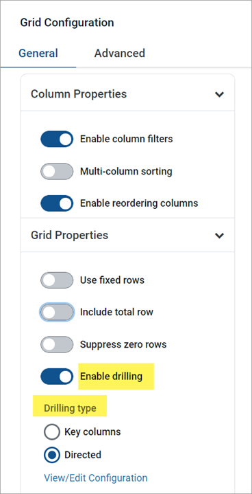 - On the General tab of the Grid Configuration properties, enable Enable Drilling.