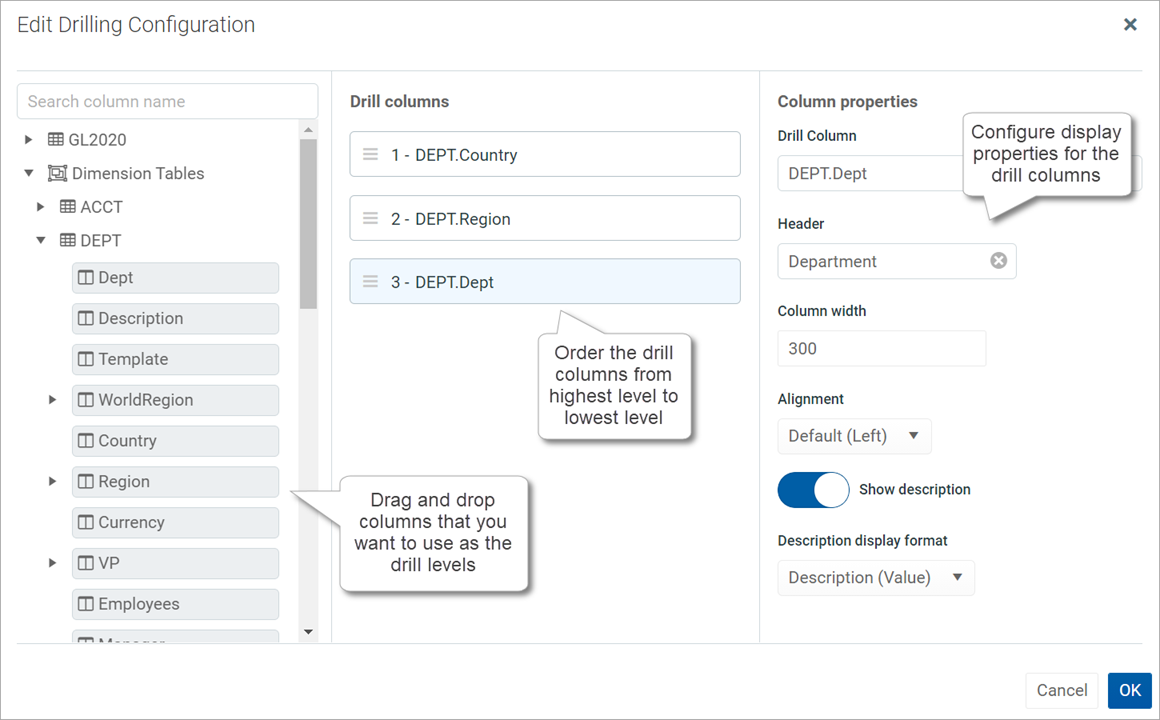 Place the drill columns in the desired order for the directed drilling. Users can drill from the column at the top of the list down to the column at the bottom of the list. Generally speaking, the lowest level of detail should be at the bottom—for example: VP > Director > Manager > Dept.