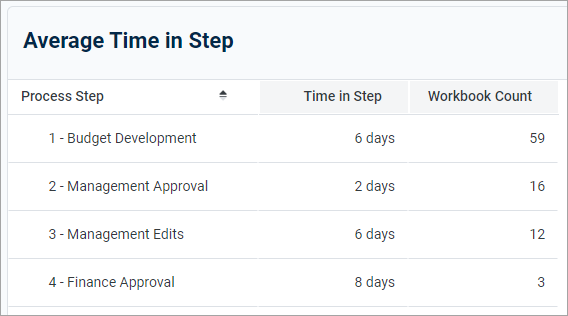 - Step statistics, such as average time spent in each step and number of workbooks in each step