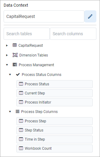 Once a file group context has been selected, a new node appears in the Data Panel named Process Management. The process columns are listed under this node, organized into Process Status Columns and Process Step Columns. To use a process column in the report, drag and drop it to the setup boxes at the top of the Report Canvas just like any other column.