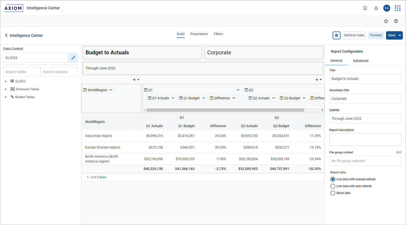 To access the Report Configuration panel, select the Build tab in the Report Builder and then click the gear button in the top right. The panel is organized into two tabs, General and Advanced.