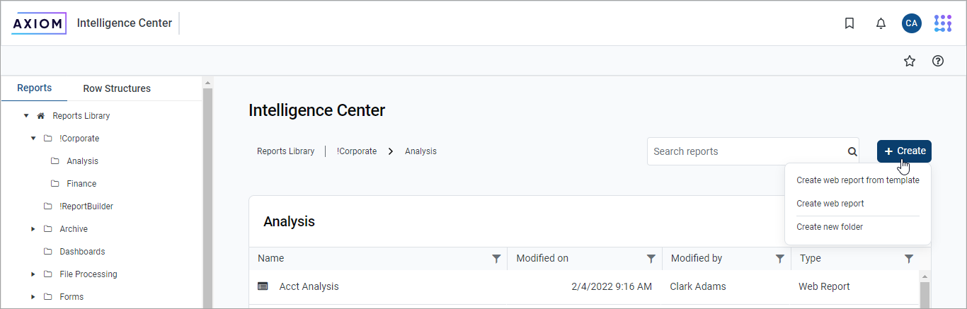 Click Create at the top right of the Intelligence Center to create new reports and new fixed row structures for use in web reports. This button is context-sensitive, depending on what area you have selected from the left-hand panel.