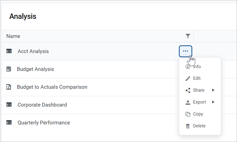 In the Intelligence Center, you can use the Actions menu to perform other report and folder management activities. To view the available actions, navigate to the item, and then hover your cursor over the ellipsis icon to the right of the Name column. Actions are available for report files, report folders, and fixed row structures.