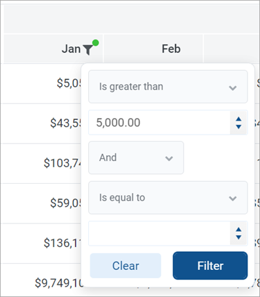 If the web report uses a data grid with dynamic rows, you may be able to filter the report by the column data. For example, you might want to filter a column to hide zero-value records, or to show all records above or below a certain value. You might want to filter a dimension column to hide or show certain dimensions (such as departments, accounts, and so on). The report designer determines whether a column is enabled for filtering.