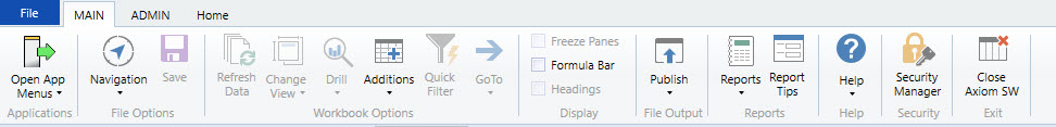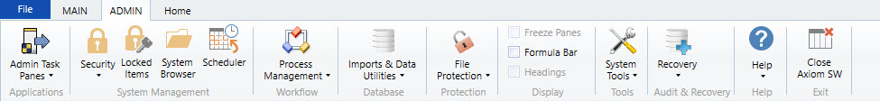 Includes commands for managing and configuring security, Scheduler jobs, processes, and data as well as other system-related tools used by administrators. This ribbon tab only appears to users with administrator privileges. Access to online help for products and advanced topics (Axiom platform) is also available.