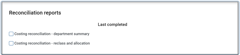 Because a key part of the costing process involves reviewing reconciliation reports, you can select from a limited number of standard reports on the Cost Processing page and generate them at the end of the costing process. These reports are refreshed for the current cost model and saved to the snapshot folder under the EDS section of the Reports Library.