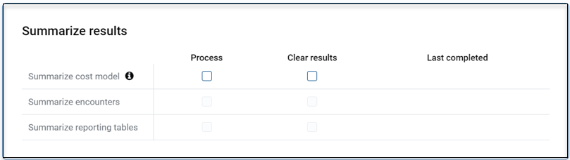 To unlock and include subsequent tasks, you must complete earlier summarization tasks or select them to process on this run. Like the process cost section, each step is displayed with the option to process or clear the task. The last completed date is also displayed.
