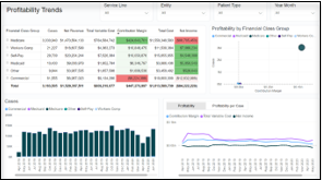 The Service Line dashboard offers much of the same content that is available in the legacy versions, but in a format that replaces many tabular summarizations with updated informative visuals. See the following images for examples.
