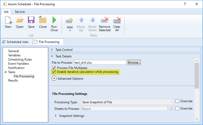 In Scheduler, the File Processing task and the Process Document List task now have an option to Enable iterative calculation while processing. If this option is enabled, then iterative calculations will be enabled for the processing of the target file. The iterative calculation settings are fixed at a maximum of 100 iterations and a maximum change value of .001.
