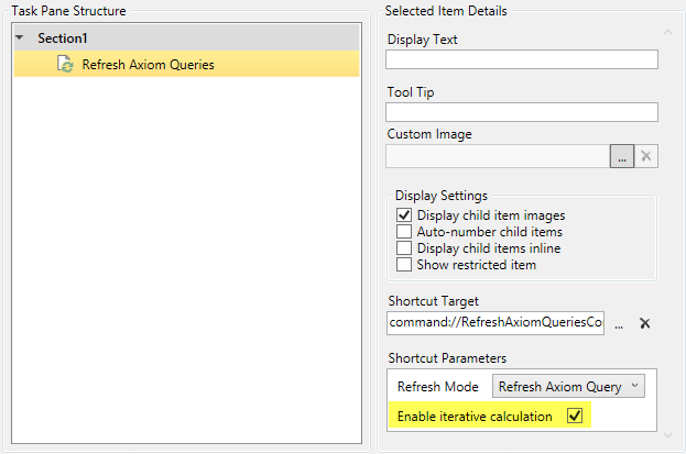 If you need to calculate a file using iterative calculations from within the Axiom client, you can set up a custom task pane or a custom ribbon tab (including customizing the default Axiom tab or Axiom Designer) to use the Refresh Axiom Queries command from the Command Library. In the shortcut parameters, select Enable Iterative calculation. You can then use this task pane to refresh any file that requires iterative calculations.