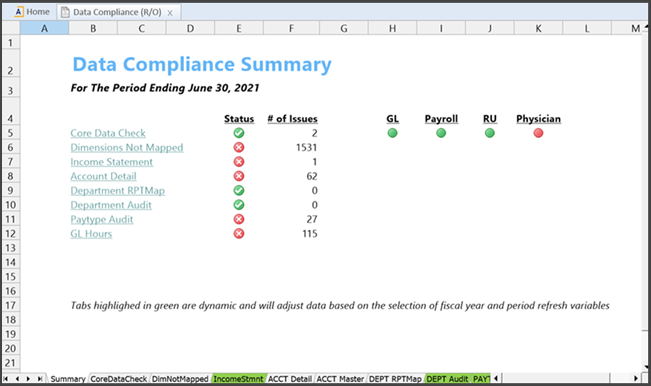 After opening and refreshing Syntellis audit reports, you can review the following information in the Data Compliance Audit report:
