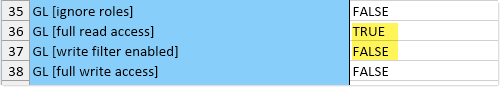All table types are listed first, followed by all individual tables. If [write filter enabled] is False for a table or table type, this means that the user or role's write access permissions are the same as their read permissions. In this case, the other write access permissions in the spreadsheet can be ignored, because they do not apply. For example, the following user has full read and write access to the GL table type, because [full read access] is True and [write filter enabled] is False. Even though [full write access] displays False, it does not matter because the setting does not apply.