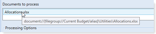 You may want to specify the document to process using a file group alias, so that the task does not have to be manually updated after rolling over to a new file group for a new year of planning. When you are selecting a document in the Axiom Explorer dialog, you can expand the file group alias to see all of the files in the current target of the alias.