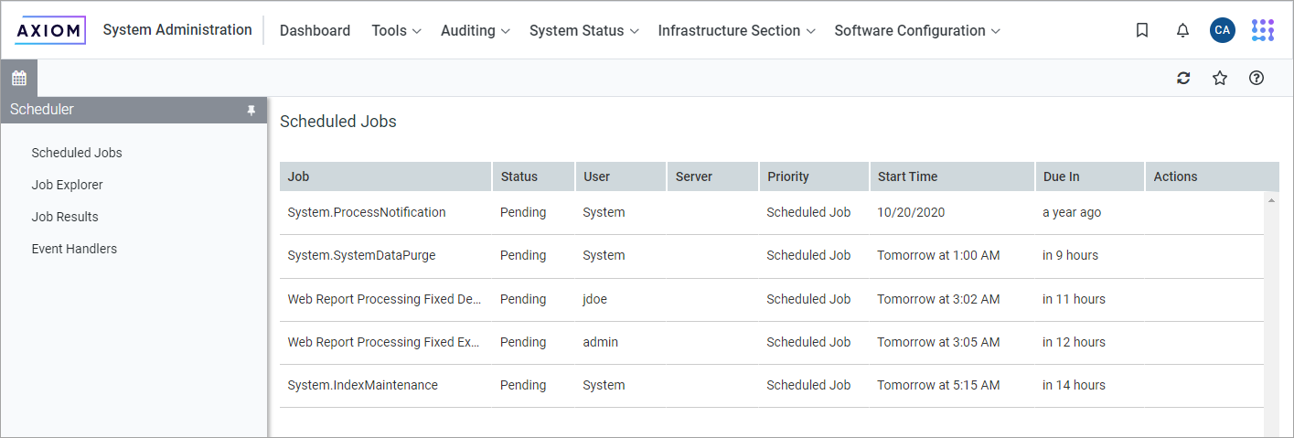 The Scheduler area of the Web Client can be used to monitor and manage the job schedule, review job results, and process existing jobs on demand. Only administrators and users with the Scheduled Jobs User permission can access Scheduler.