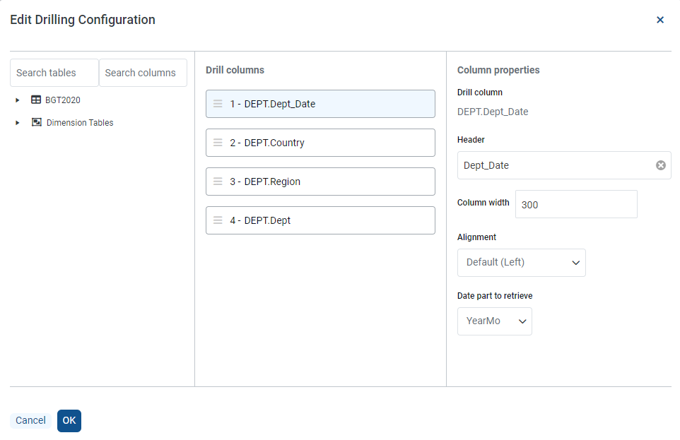 Drag and drop columns from the table tree to the Drill Columns area in the middle of the dialog. The available columns for drilling depend on the table specified as the primary table for the data context: