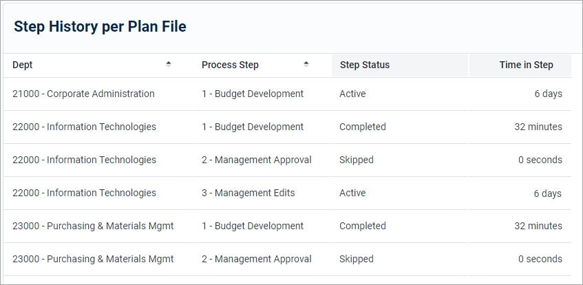 - Process step history per plan file, including the name and number of each step the plan file has been active in, the plan file's step status, and the time spent in the step