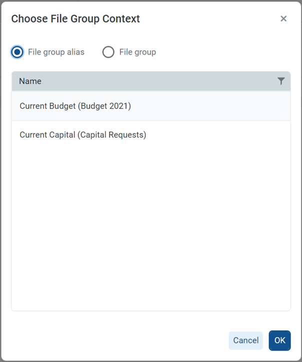 Selecting a file group alias means the report will be dynamically associated with the file group that is currently assigned to the alias. For example, if the Current Budget alias is updated so that it points to the Budget 2024 file group instead of the Budget 2023 file group, the report will update to show the process information for the Budget 2024 file group.