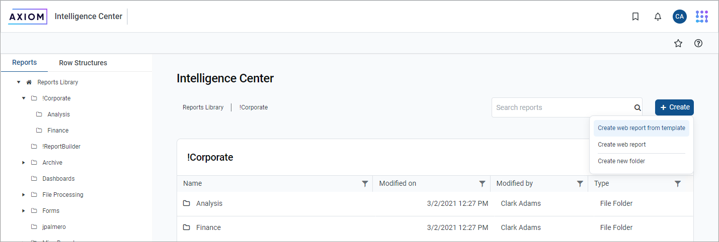 Using the Intelligence Center, you can create new web reports from a template. Currently, templates are only provided by installed Axiom Strategy Management products. For more information about any templates provided by your installed products, see the separate product documentation.