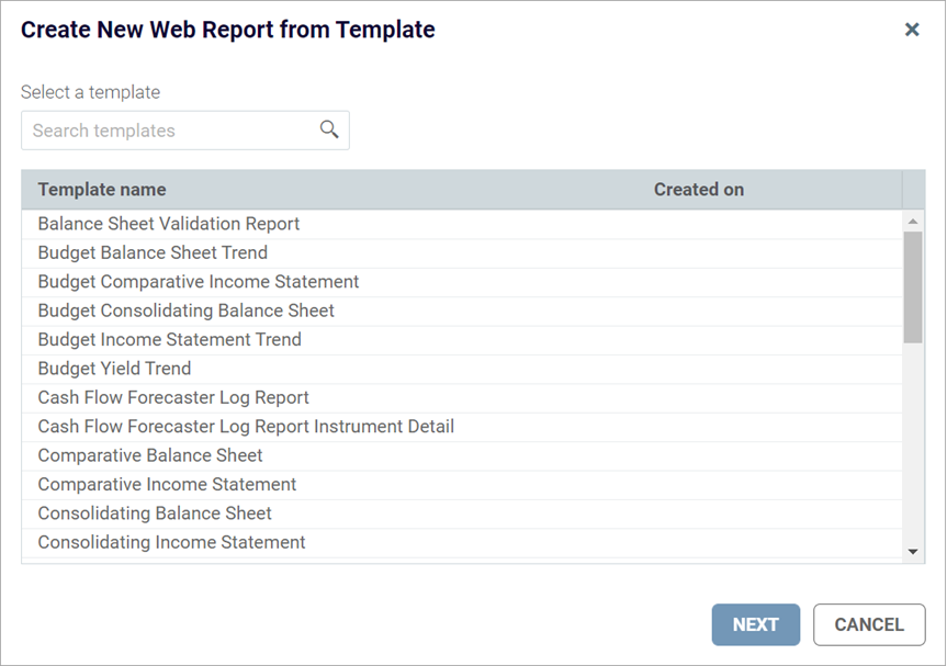 On the template screen, select the template that you want to use to create the report, and then click Next.