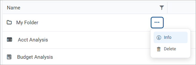 Hover your cursor over the row with the folder, so that the ellipsis icon is visible in the Name column. Click the icon, and then select Info from the menu.
